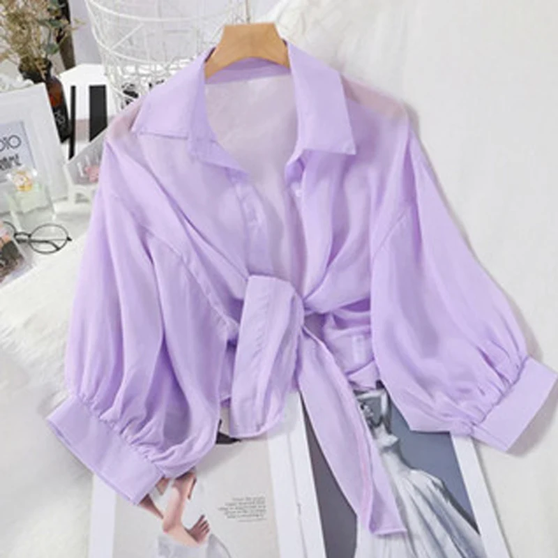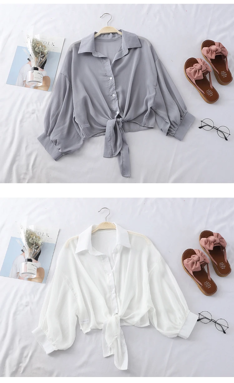Be the first to review “Casual Loose Hollow White Clothes Elegant Solid Color Tied Waist Blouse Women Summer Bat Half Sleeve Button Chiffon Shirt 9776”